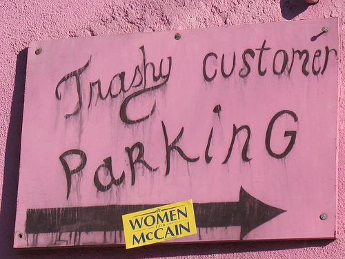 I took the Trashy Lingerie photo. The very next morning the sticker was removed. I will bet you all my garters that management didn’t want their fine undergarments tainted by any kind of Palin association, even if it was a joke!
