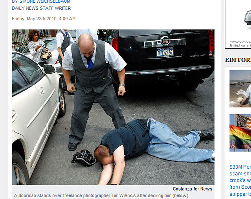 It should be noted that Wiencis was on a public sidewalk covering a news event as part of his job, and the doorman was certainly out of line — inexplicably resorting to violence to protect…what? A very possible criminal who lives in his building. It doesn’t seem worth it.