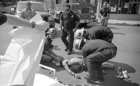 Then, a short while later, a bicyclist traveling north on Western Boulevard and only one block east of where the shooting took place, was struck by a vehicle as he crossed Virginia Avenue. The unknown cyclist sustained a head injury, a large laceration to his knee, and was transported to an area hospital by the Los Angeles Fire Department. The driver of the vehicle remained on scene, and according to one man who witnessed the accident, the cyclist was at fault. And finally, as I made my way home to process the photos and get them to my editor, I saw a man wielding a tire iron chase another man down the street. I love this neighborhood.