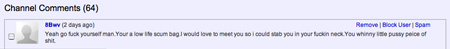 Over the past two years or so, we have received plenty of disparaging comments from various people on YouTube, but this one from “8Bwv” (which was left July 30, 2010) is probably one of the angriest and most threatening comments that we have had the pleasure of reading.