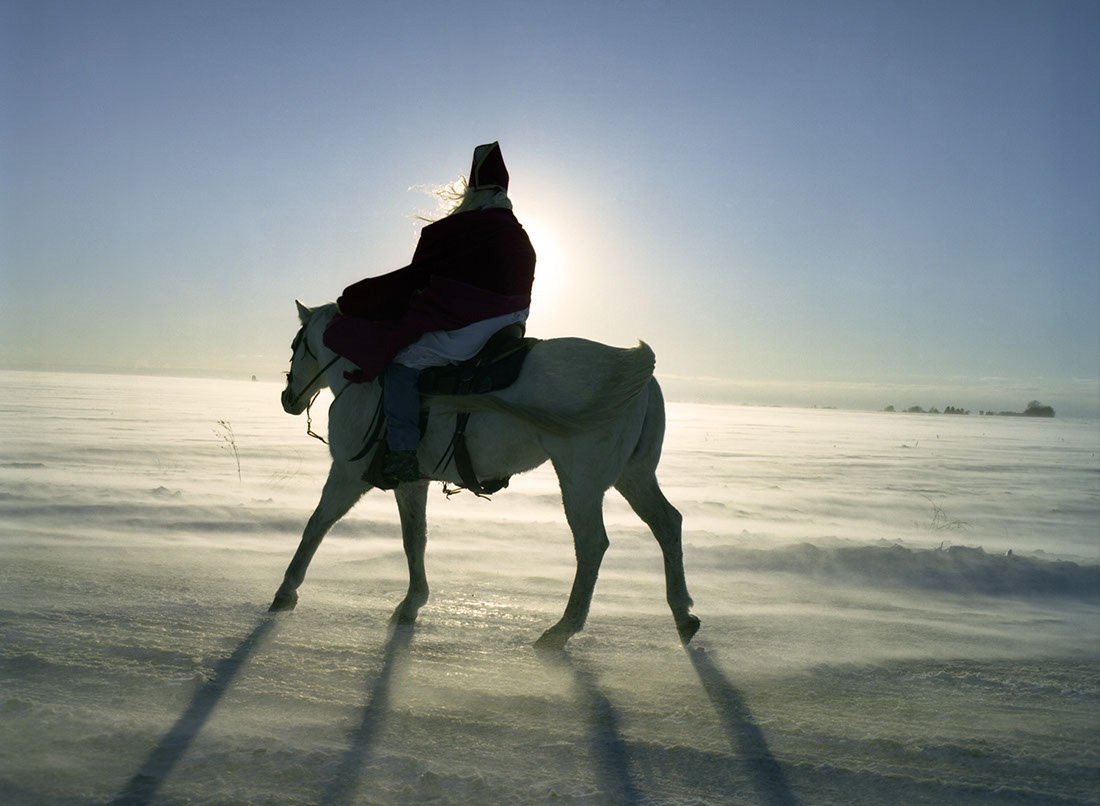 We asked him to give us his favorite photo from the project, and this is what he said: “It is hard to choose one picture, but Dutch St. Nick, known as Sinterklaas, in the snow is one of my favorites. In Holland, St. Nick is the children’s friend who comes on horseback every 5th of December and brings presents and sweets. For the picture I wanted him more like a lonesome rider like in westerns or the song from the Doors, “Riders on the Storm.” I borrowed the cloth from the Dutch Consulate in New York. We shot this picture outside Orange City, close to a farm, it was below zero and the wind was hard. I photograph with on old Pentax 67 and it would freeze to my hands. We were with a lot of people, people from the farm, and the rider came out with his family. Everybody was excited and patient. I shot several scenes, but at the end of the day, when the sun set and the cold was the most brutal, I shot St. Nick alone against the setting sun. I love the light and the shadows, how the wind goes through his hair and the solitude of the ice field.”