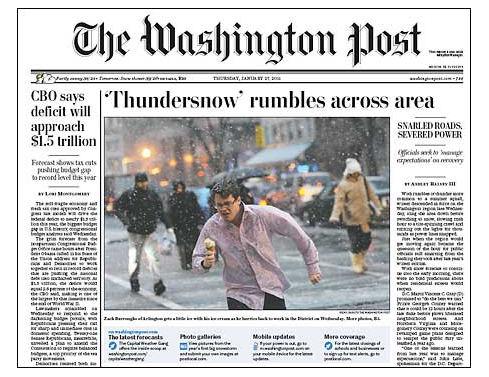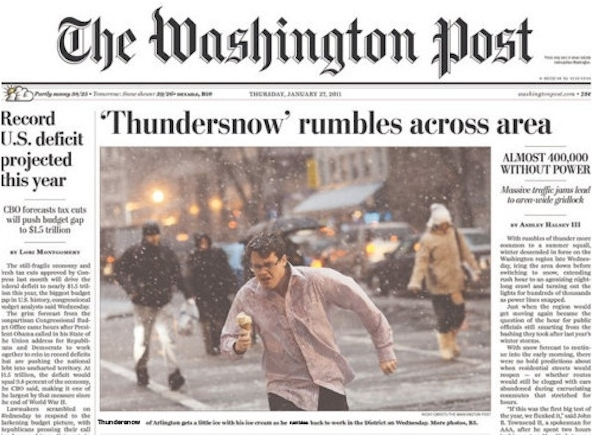 When Washington Post editors send out a photographer to get the age-old “snow is falling” photo, a coatless man crossing the street with an ice cream cone in hand is not what you expect at all. That’s the shot Ricky Carioti got, which landed on the front page of the Post yesterday. So, naturally, people were curious and amused and, then of course, as what follows in our digitally mad world, they got creative, photoshopping the guy onto nonsensical backdrops.