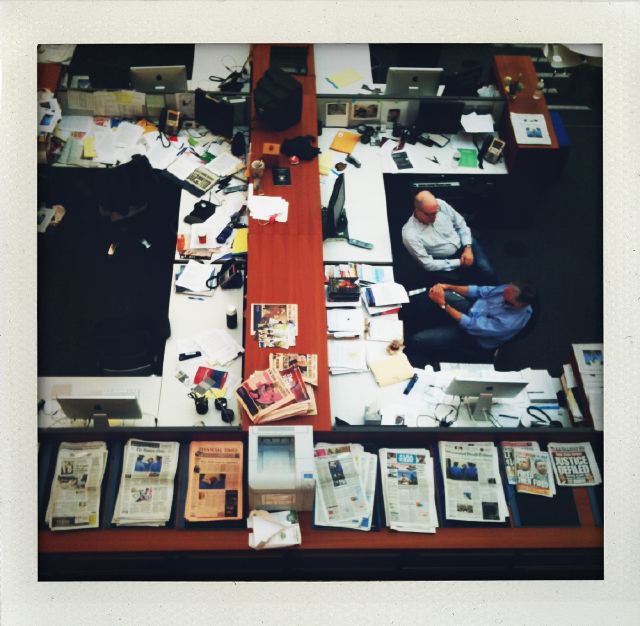 The above shot, from New York Times photographer Todd Heisler, is a somewhat rare look at the New York Times behind the scenes (that’s Editor Bill Keller and Managing Editor John Geddes talking something over)….