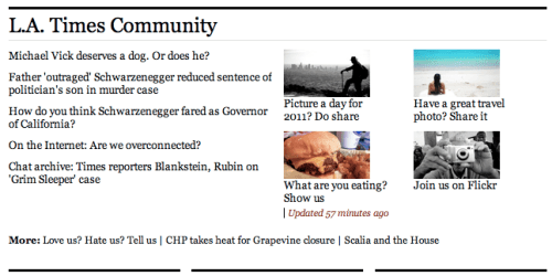 User-generated content is the future of newspapers, so it was only a matter of time before the L.A. Times added a flickr-linked photo feature to its web site. The decision came about as a result of the web team looking for ways to engage the readership and finding that the in-house methods they tried just didn’t catch on. The new flickr group was started in early December, and every day they’ll choose a photo to feature on L.A. Now and Southern California Moments.