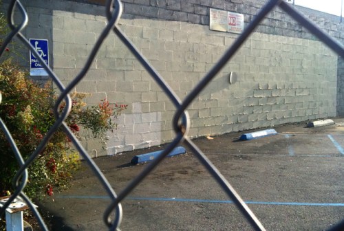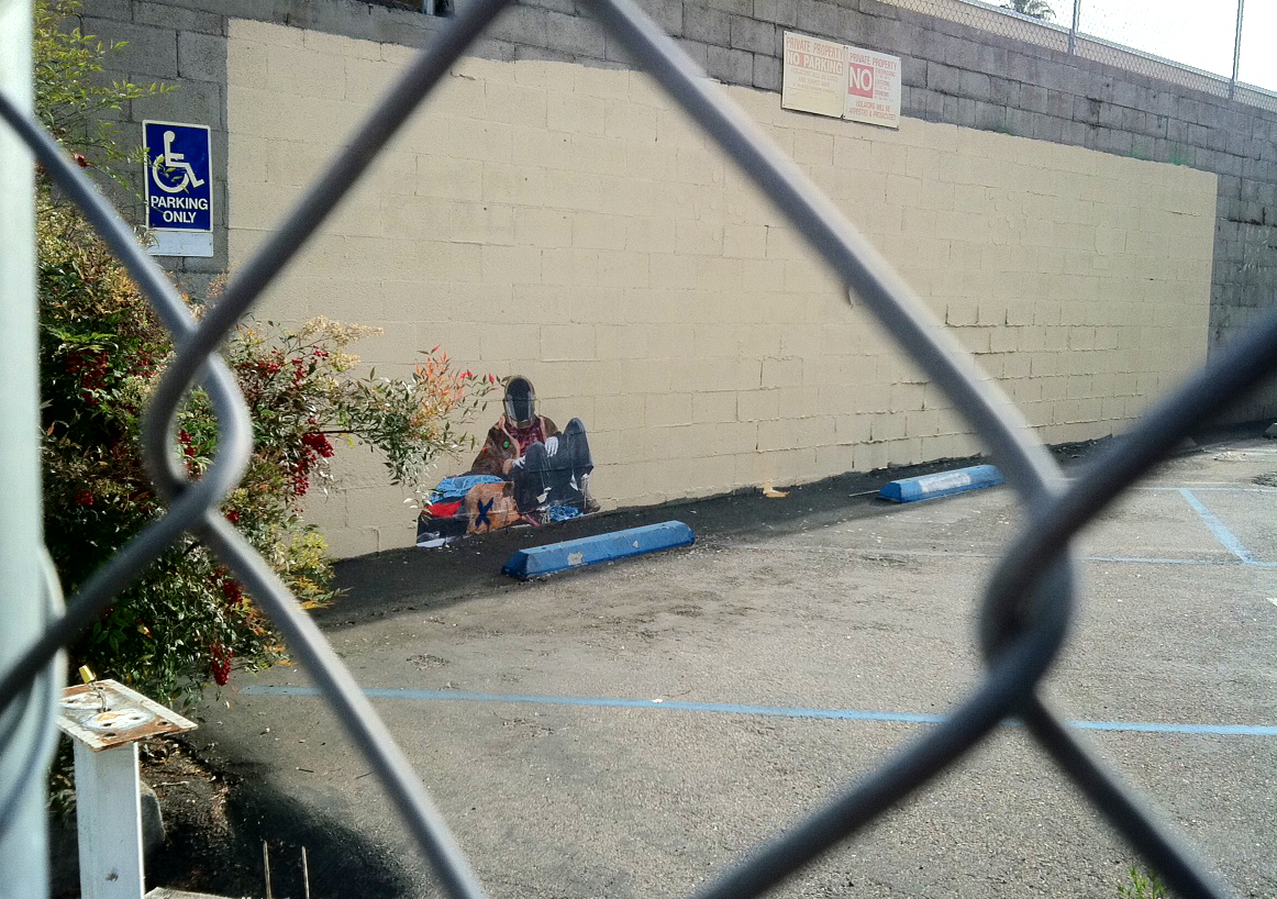And I’m not too sure if anybody else has even noticed this lowly homeless man who has taken refuge inside an abandoned, fenced-off parking lot. He hasn’t even been mentioned on LAist.com, which is always covering Banksy’s latest street creations in Los Angeles.